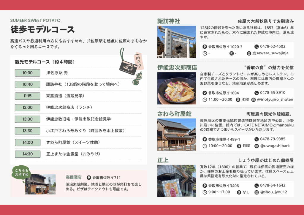JR佐原駅 → 諏訪神社(128段の階段) → 東薫酒造(酒蔵見学) → 伊能忠次郎商店(ランチ) → 伊能忠敬旧宅・伊能忠敬記念館見学 → 小江戸さわら舟めぐり(町並みを水上散策) → さわら町屋館(スイーツ休憩) → 正上または金蜜堂(おみやげ)