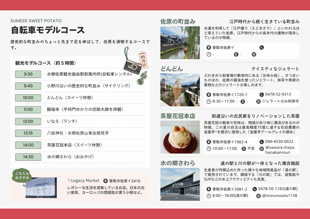 JR佐原駅 → 水郷佐原観光案内所(自転車レンタル) → 小野川沿いサイクリング → どんどん(スイーツ休憩) → 観福寺(平将門ゆかりの厄除大師を拝観) → いなえ(ランチ) → 八坂神社・水郷佐原山車会館見学 → 茶屋花冠本店(スイーツ休憩) → 水の郷さわら(さつまいもやおみやげ購入)