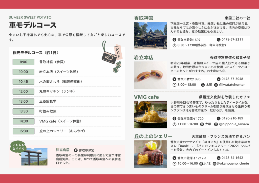 香取神宮 → 岩立本店(スイーツ休憩) → 水の郷さわら(観光遊覧船) → 丸惣キッチン(地元野菜を使ったランチ) → 三菱館見学 → 町並み散策 → VMG cafe(スイーツ休憩)→ 丘の上のシェリー(おみやげ)
